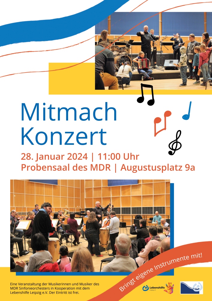 Die Musikerinnen und Musiker des MDR-Sinfonieorchesters laden zum Mitmach-Konzert ein. Das Konzert findet am 28. Januar 2024, um 11 Uhr Uhr im Probensaal des MDR statt (Augustusplatz 9, schwarzes Gebäude neben Uniriese).