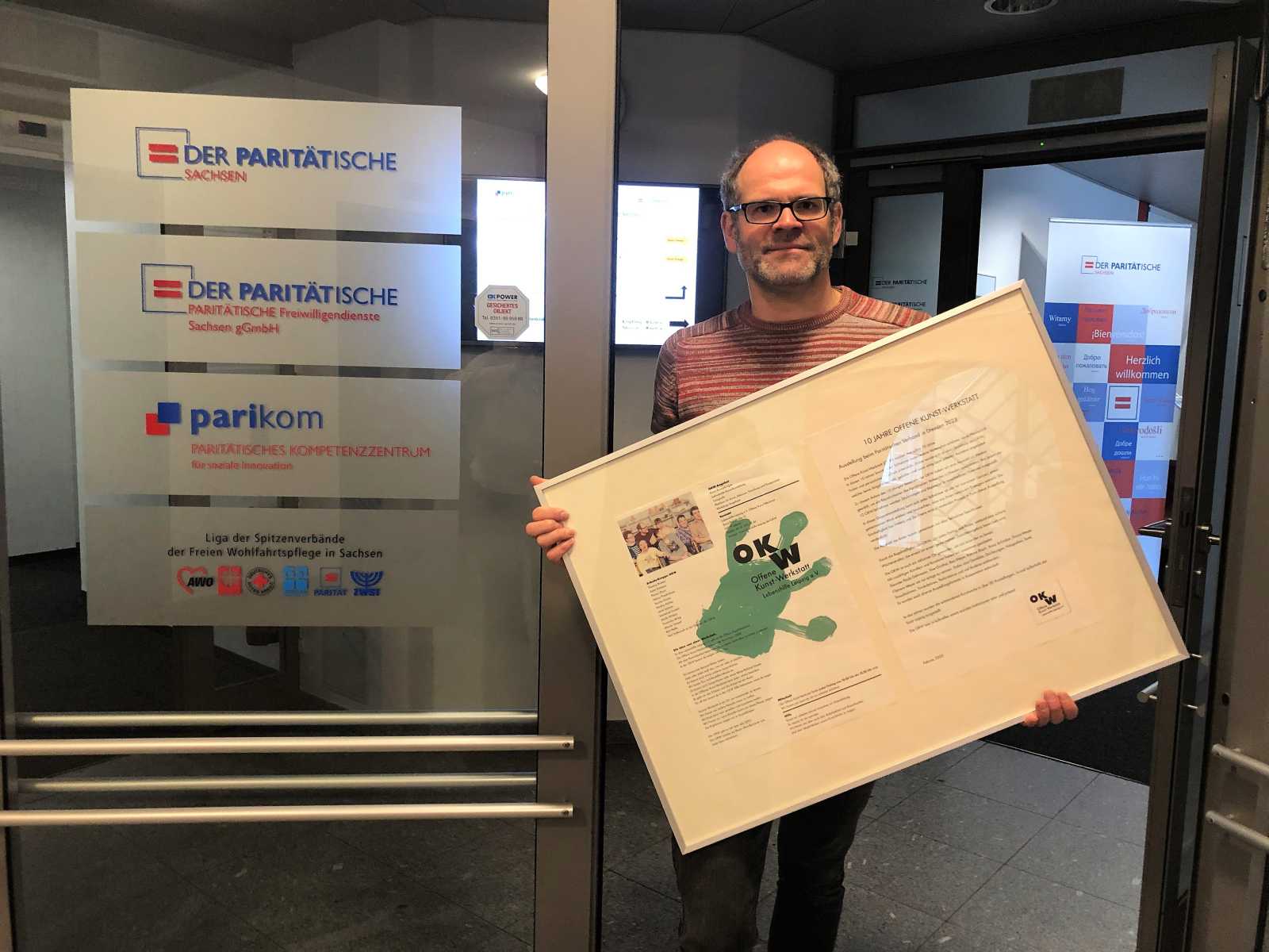 Aus Anlass des 10-jährigen Bestehens der OKW haben wir eine Auswahl an Werken gewählt, um die Räumlichkeiten des Paritätischen Verbandes in Dresden auszustatten. Von Jedem der zwölf OKW-Teilnehmer werden Zeichnungen und Malereien in verschiedenen Formaten ausgestellt. In dieser Gruppenausstellung kann sich jeder Teilnehmer als ein Teil von einem Ganzen, einem gemeinsamen Werk erleben und beobachten, dass aus ihnen heraus ein Erzeugnis entsteht. Die Sinnhaftigkeit des Malens und Zeichnens wird im endenden Prozess in Form dieser Ausstellung verdeutlicht. Die Auswahl der Bilder wurde gemeinsam mit allen Teilnehmern beschlossen. Durch die Regelmäßigkeit der OKW, die jeden Freitag stattfindet, entstand eine sichere Wochenstruktur, die erneut mit einem gemeinsamen Zwischenergebnis bereichert wird.