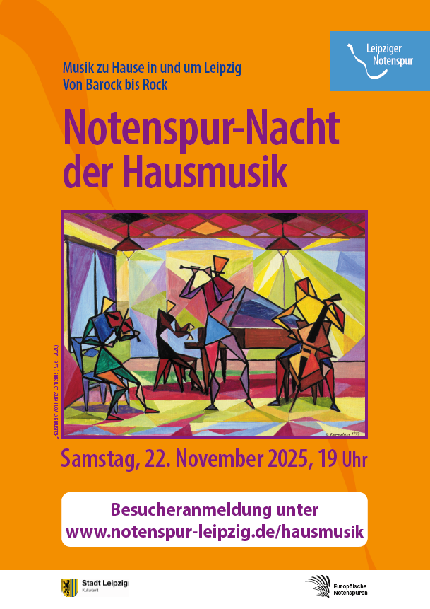 Am Samstag, den 22. November 2025, findet in ganz Leipzig wieder die Notenspur-Nacht der Hausmusik statt. An diesem besonderen Abend öffnen musikliebende Gastgeberinnen und Gastgeber ihre Türen und laden zu kleinen Konzerten in privaten und ungewöhnlichen Räumen ein – in Wohnzimmern, Praxen, Werkstätten oder Ateliers.