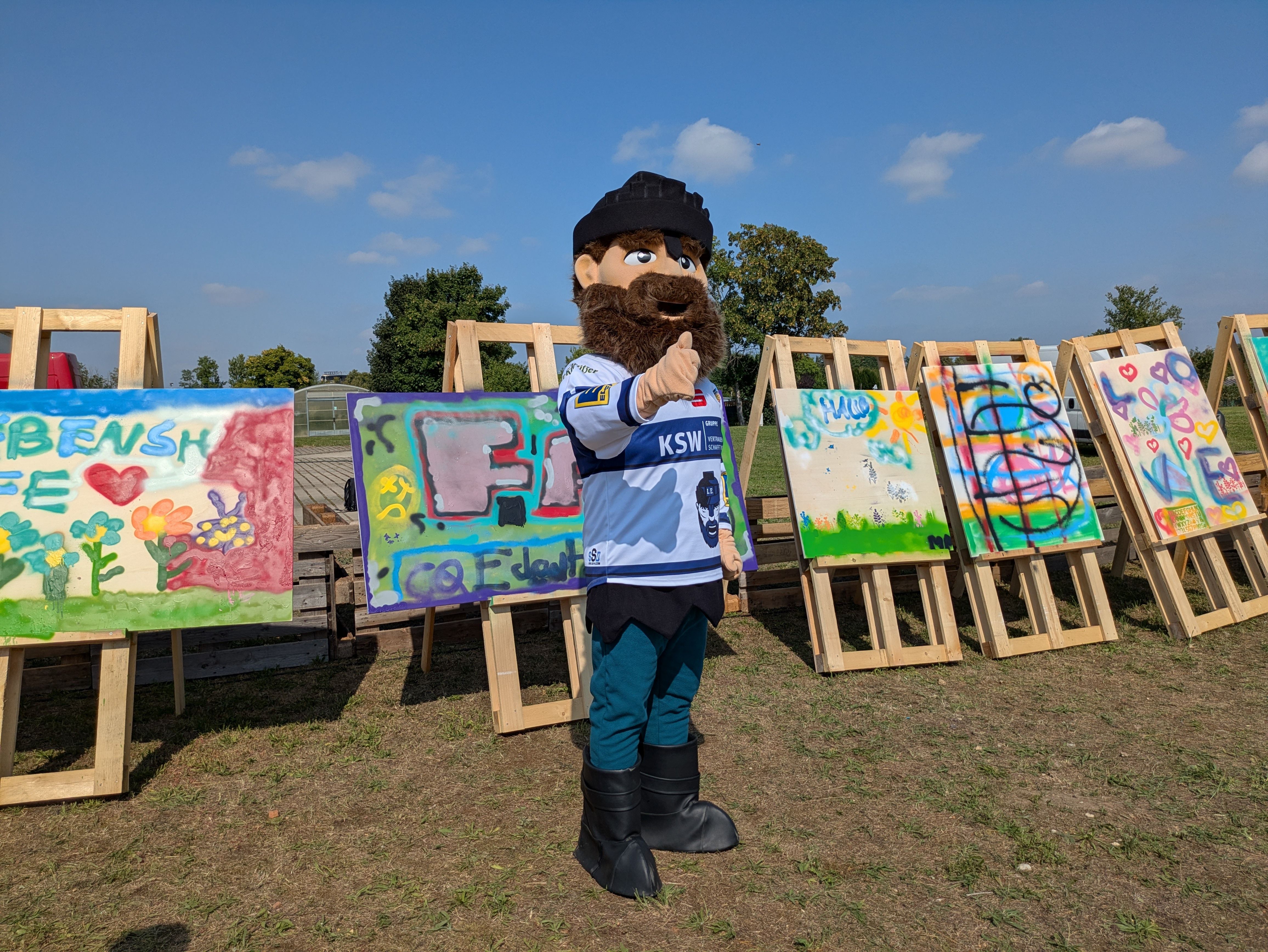 das Maskottchen „Thor“ und Spieler der Icefighters Leipzig